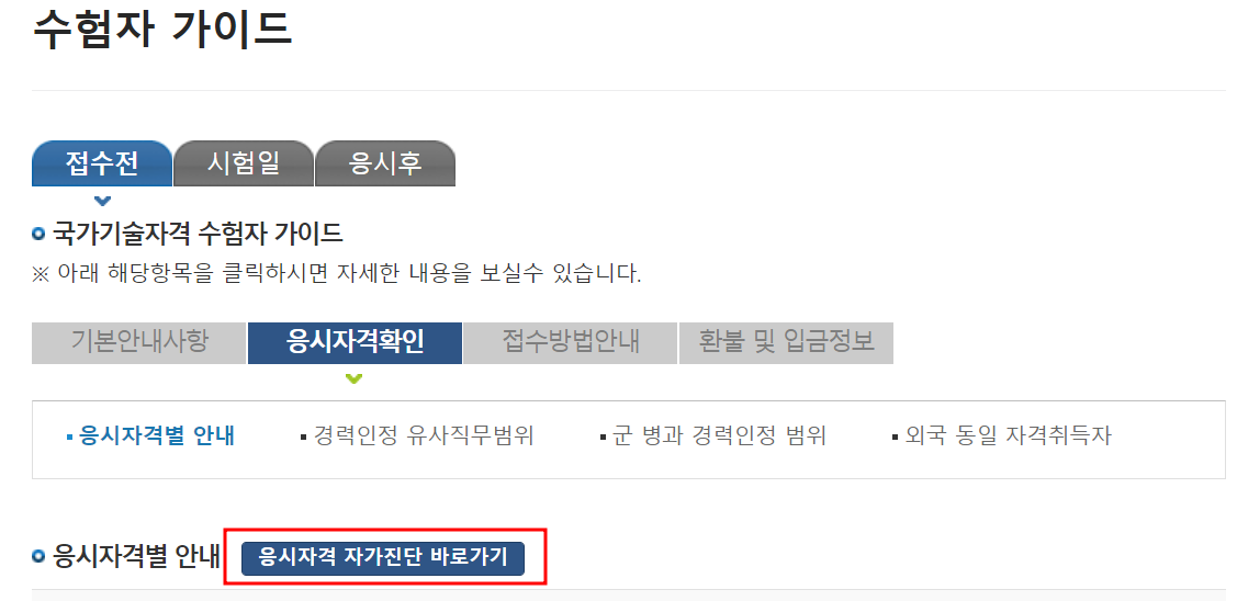 그래서 한국산업인력공단에서는 산업기사 자격시험을 준비하는 수험생을 위해 응시자격 자가진단을 할 수 있는 서비스를 제공하고 있는데요.