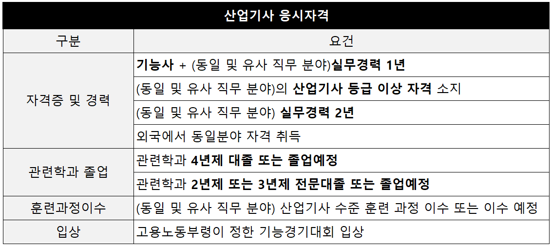 | 훈련과정이수 | (동일 및 유사 직무 분야) 산업기사 수준 훈련 과정 이수 또는 이수 예정 |