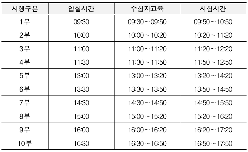 중식조리기능사 필기시험은 아래 표와 같이 시험 시간을 1~10부로 나누어 시험을 시행하고 있기 때문에 응시자가 원서접수기간에 원하는 시간을 선택해 응시할 수 있습니다.