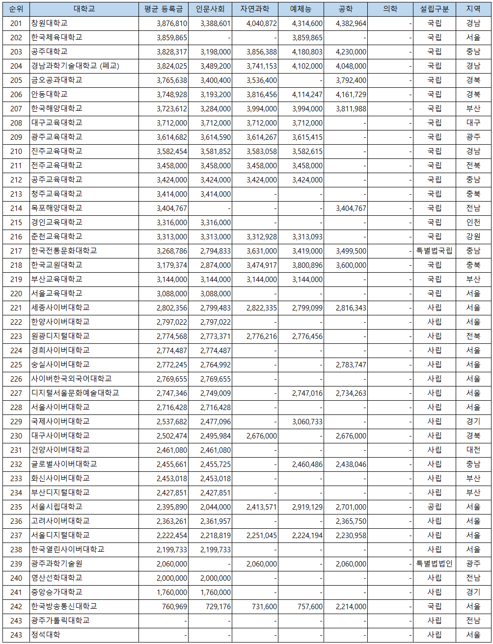 지금부터 대학알리미에서 찾은 2023년도 4년제 대학교 244개의 등록금 순위를 1위부터 244위까지 표로 정리했습니다. 각 대학교의 평균 등록금이 아닌 인문사회계열, 자연과학계열, 예체능계열, 공학계열, 의학계열의 등록금은 표 아래 있는 이미지를 보시기 바랍니다.