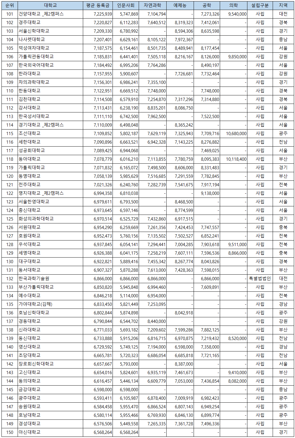 | 172 | 대전가톨릭대학교 | 5,760,000 | 사립 | 세종 |